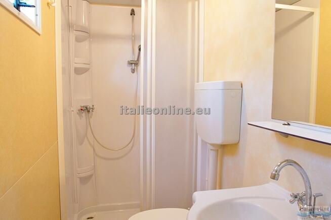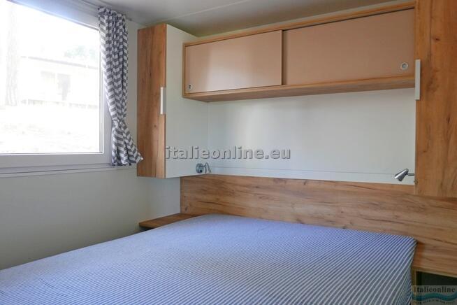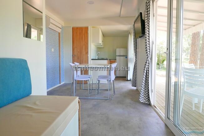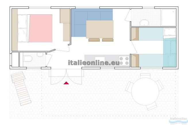 Mobilhome pro 6 osob - obývací pokoj s kuchyňským koutem a rozkládací pohovkou, ložnice s dvoulůžkem, pokoj se dvěma samostatnými postelemi, koupelna, TV, lednice, okna se sítěmi proti komárům a veranda se stolem a židlemi. |